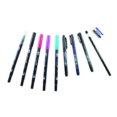 Set que contiene todo el material necesario para el hand lettering avanzado. Incluye manual de instrucciones con recomendaciones y trucos para mezclar colores. Productos incluidos: – 4 rotuladores ABT Dual Brush con punta flexible ancha para letras grandes y punta fina para detalles. Colores: negro (ABT-N15), deep magenta (ABT-685), cherry (ABT-815) y sea blue (ABT-373). – Blender Pen incoloro (ABT-N00) para suavizar y mezclar colores. – Lápiz de grafito de alta calidad MONO 100 a prueba de borrones. Grado de dureza 3H (muy duro). – Rotulador de caligrafía Fudenosuke en dos versiones: punta fina pincel firme – grado de dureza 1 (duro) y punta fina pincel blanda flexible – grado de dureza 2. Tinta color negro. – Rotulador permanente MONO twin con doble punta: fina y ancha. Tinta color negro. – Goma de borrar MONO XS para un borrado limpio y exacto.